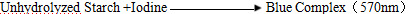 α-淀粉酶催化淀粉分子中的α-1,4糖苷鍵水解,產(chǎn)生葡萄糖、麥芽糖以及糊精等,碘可以與未被水解的淀粉結(jié)合,生成在570nm下有特征吸收峰的復(fù)合物,其深淺可計(jì)算出淀粉酶的活力單位。α-AL耐熱,但是β-淀粉酶可在70℃ 鈍化15min。因此粗酶液經(jīng)過70℃鈍化15min,就只有α-AL能夠催化淀粉水解。