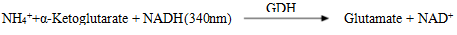 GDH催化NH4+ 、α-酮戊二酸和NADH,生成谷氨酸和NAD+ ,引起340nm吸光度下降。通過測定NADH的變 化,計算α-酮戊二酸含量。