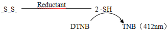 還原劑會(huì)使二硫鍵裂解,裂解后的巰基會(huì)發(fā)生親核反應(yīng), 即巰基與5,5’-二硫代-雙-硝基苯甲酸(DTNB)反應(yīng),生成黃色化合物,在412nm處有吸收峰,據(jù)此可以計(jì)算蛋白質(zhì)二硫鍵含量。