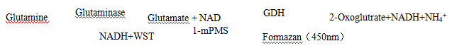 游離谷氨酰胺在谷氨酰胺酶的催化作用下轉(zhuǎn)變?yōu)楣劝彼?,谷氨酸脫氫?GDH)催化谷氨酸和NAD生成α-酮戊二酸、NADH和NH4+,在1-mPMS作用下,WST可與NADH反應(yīng),產(chǎn)生水溶性formazan,其在450nm處有吸收峰,據(jù)此可計(jì)算谷氨酰胺含量。